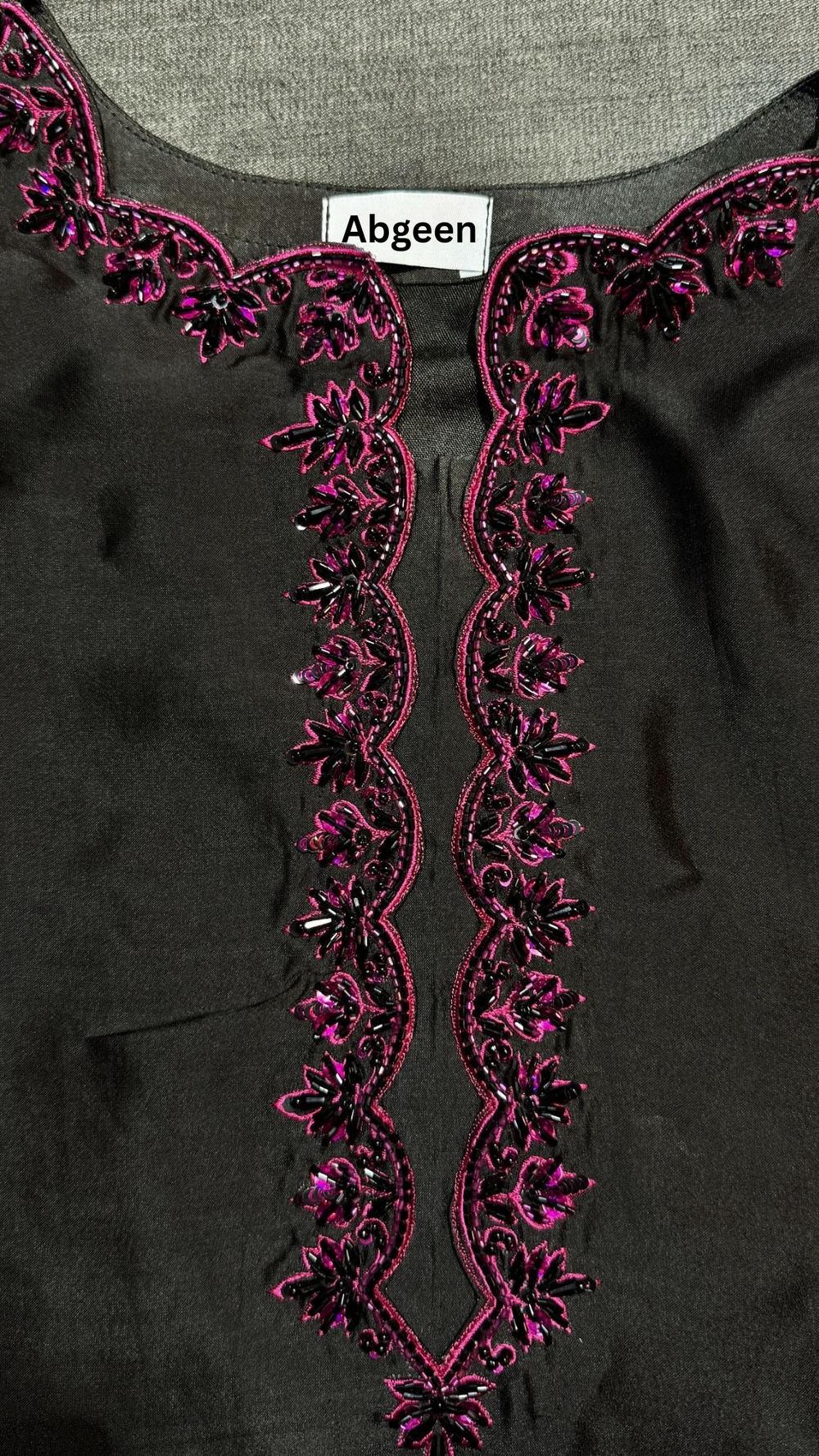 Neckline: Uniquely scalloped and embroidered neckline, adorned with intricate magenta threadwork and subtle bead accents Hand Work Touch.