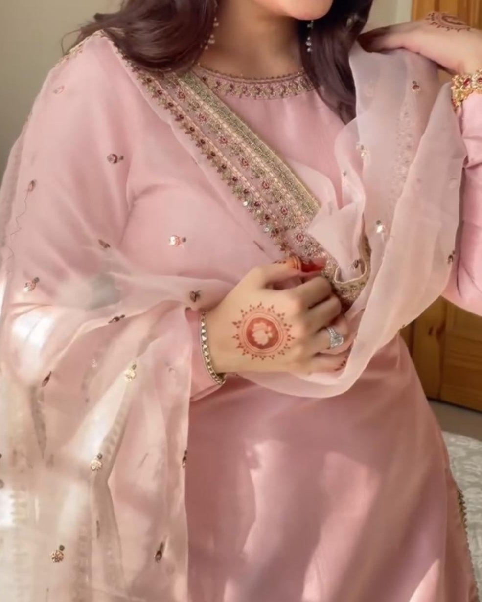 Neckline: Round neck delicately embellished with intricate golden and pink Sequance work, enhanced with tiny crystals for a refined sparkle.