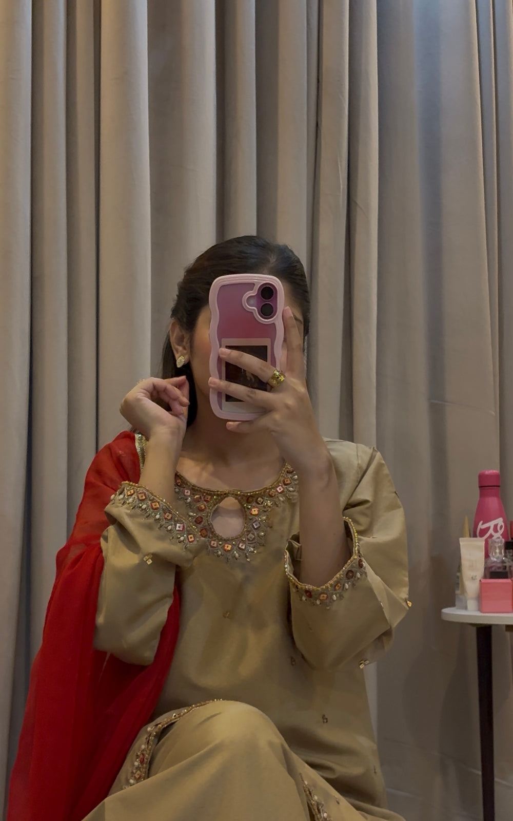 Color: Soft golden hue embellished with delicate mirror work and sequins.