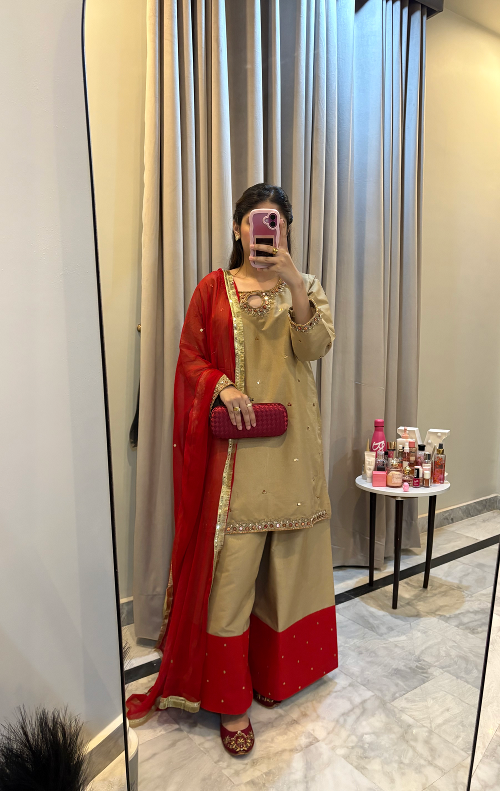Detailing: Contrasting crimson red panels at the hem, highlighted with tiny golden embellishments — giving the outfit a bold, regal touch.