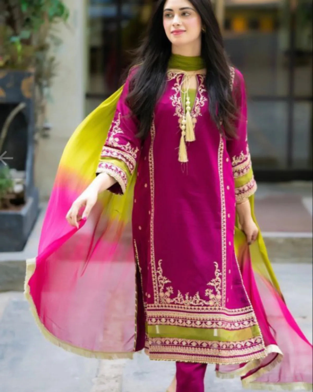 Tagline: Vibrance Meets Tradition – A Play of Magenta & Olive Elegance